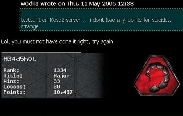 | w0dka wrote on Thu, 11 May 2006 12:33 | tested it on Koss2 server ... i dont lose any points for suicide...
