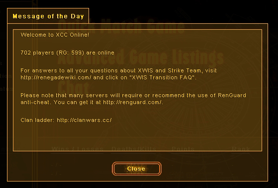 | Oblivion165 wrote on Fri, 25 August 2006 09:57 | I get a "Unable to connect to westwood online" or a "Your game has been rejected" or a "You need an update in order to play online"
