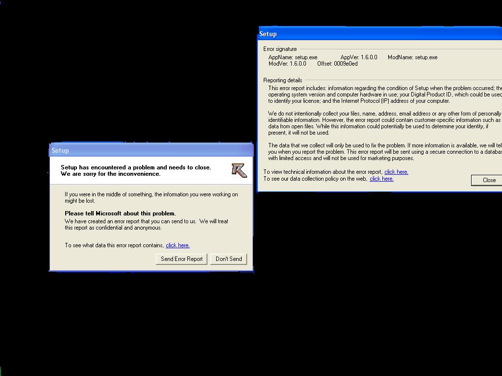 I played renegade on this computer before and i install and screen flashes black and the popup setup.exe has incountered a error comes up and it says send and dont send. Plz help me. Dont Get It