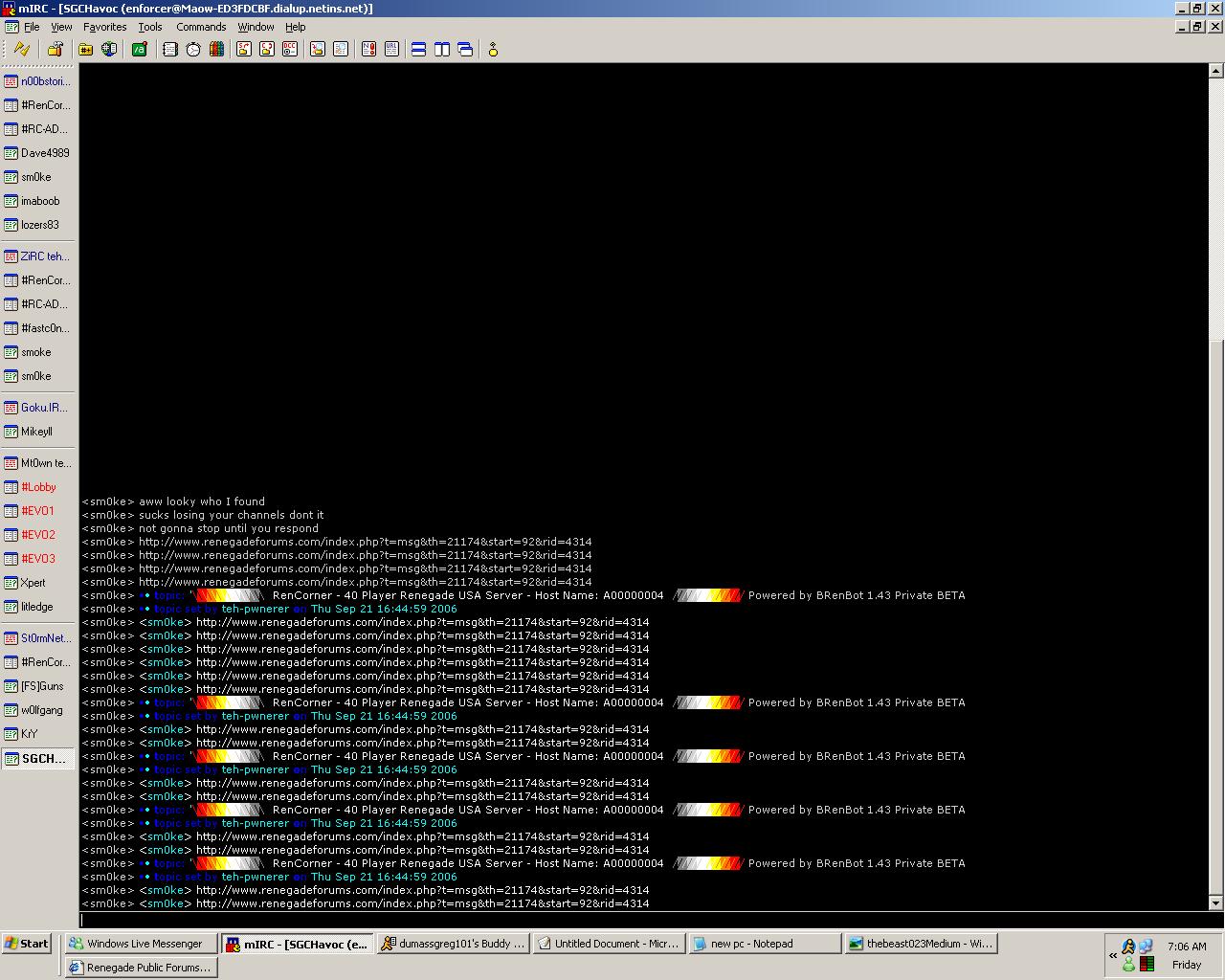 erm. You made it invite only, K, but, you banned everyone except me n u from my channel, screen shots shown above shows how you took over #rencorner on n00bstories and banned everyone from my channel. Then in #rencorner on st0rm, you started spamming it, then having a convo with an IRC Op. Also. You hacked my servers, hacked my hosting forums (now replaced) and spam the living hell out of my rencorner forums. The more shit you continue to do, the more shit your getting on your rep. I don't care about mine since everyone here hates me. Atleast people will hate you as well.