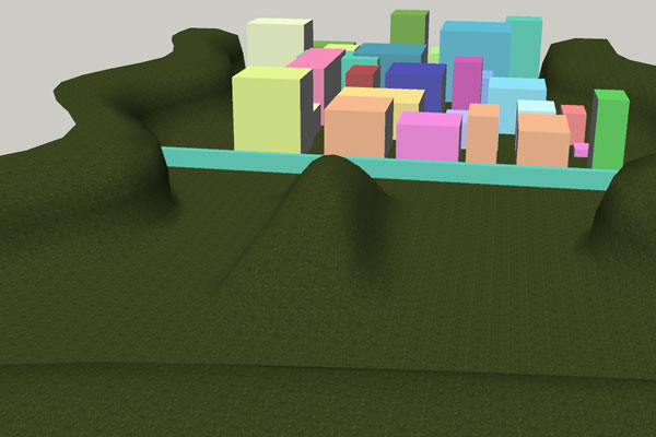 To dthdealer: Thank you for your encouragement, however I already have plenty of plans for the buildings, as stated, the current boxes are place holders, I was using them to test that I could block off the draw distance limit, and to get a rough idea of placement.
