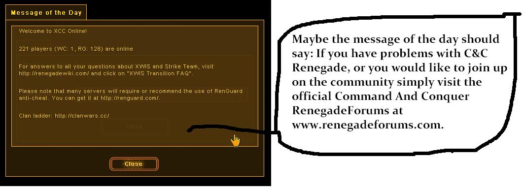 Perhaps make the MOTD pull news from www.renegadecommunity.com? Much like the old RenGuard client did (though that was just a webbrowser-like control. :\)