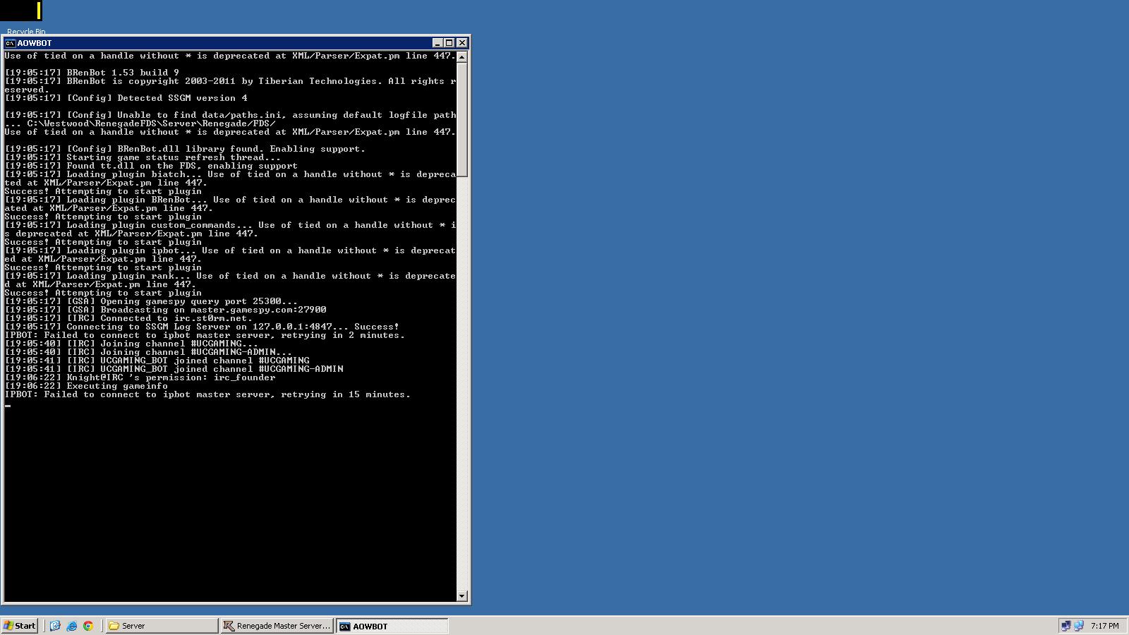 One day I started the server(because it crashed while I was at work). Went into IRC. noticed I BRenbot didnt say "Server Starting, loading map, level load ok..ect." So i did !gameover NOW, and it report that the game was restarting and didn't report "Server restarting, loading map, level load ok" Seems like it(BRenbot) stopped reporting what the server is doing "player joined..ect." I dont understand whats going on, it worked fine before with no problem! Here's a ss of what BRenbot says when it's started up...