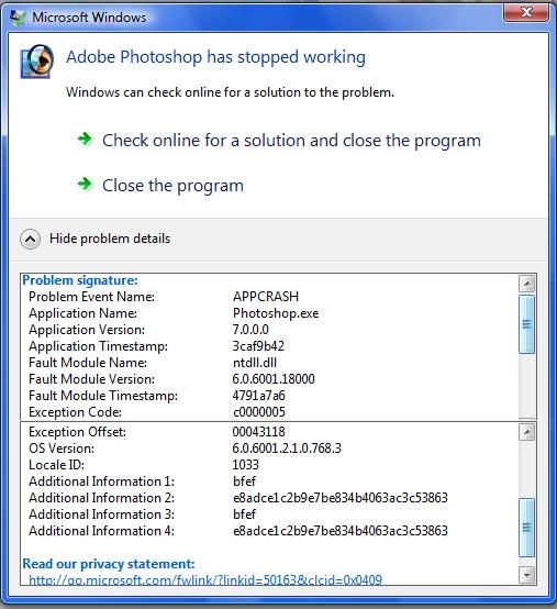 Coming upon loading (specifics in ss) i get this message that photoshop is no longer working. i uninstalled it and reinstalled it and it still does this. it may be something with my computer. i have also restarted my computer. what is going on here?