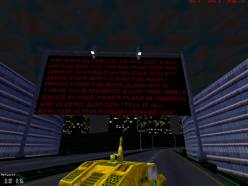 Zeratul PT2 | zeratul2400 wrote on Mon, 10 November 2003 09:49 | GENOCIDE YOU AR NOT JUST A BIG JACKAS AND YOU THE BIG HEAD JUST YOU CREATE DUSK FLAYING FUCK YOU BIG JAKAS YOUR MAPS IS BAD YOU WANT I WRUGHT THIS THE MAPS IS BAD HEY IS ONE YEAR YOUR PROMESS A WARPATH MOD WERKING BUT IT NO WORK AND DONT JUST GENOCIDE I TELL IT ALL REPLYER IN THIS FORUM I DESLIKE YOU.