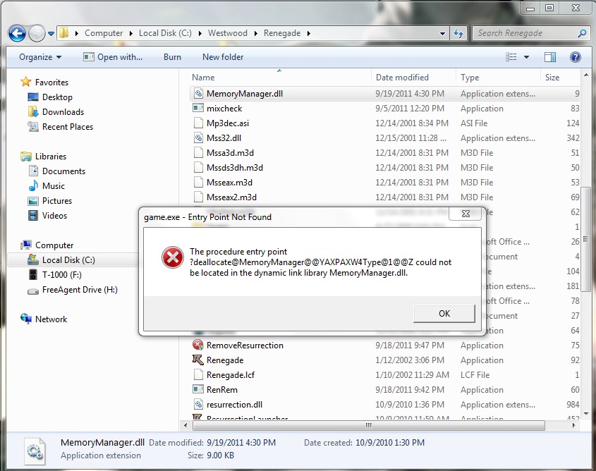 Needless to say, this is very upsetting. Renegade is the only video game I play, and I love it. I don't know much about computers, so that error text may as well be Greek. All I know is that I do have the MemoryManager.dll file. I tried uninstalling and reinstalling Renegade, but no dice. I have attached a screen shot of my troubles. Does anyone know how to fix this? Thank you in advance.
