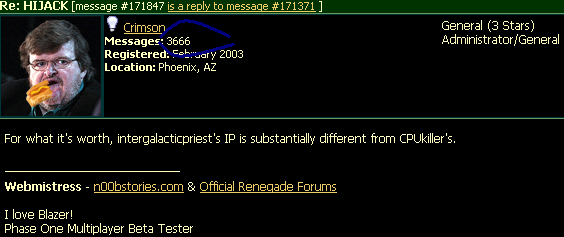 I did find out intergalacticpriest is who I thought it was, just one of my brother's friends (and an immature one @ that. Hangs out @ totse, etc.)