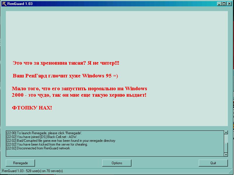 I use Windows 2000, as you all know, normal work of RenGuard on my OS is a miracle. For some unknown reason, RenGuard worked now. I, as usual, connected the server and received this. I use standart game.exe which is created by RenGuard installation. but this stupid program thinks that ITS OWN GAME.EXE IS A CHEATER ONE! Big Grin