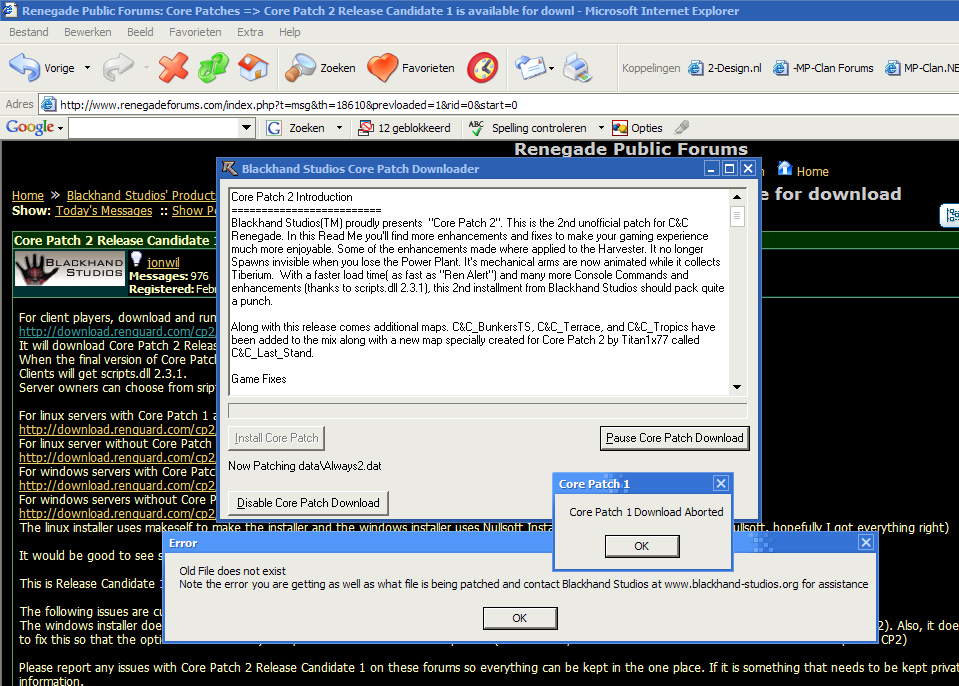 If you have installed CP1 (especially CP1 standalone) and the installer is donwloading patchall.zip (not cp2.zip) open up regedit and go to HKEY_LOCAL_MACHINE\software\RenGuard and check the patch version key. If you have CP1 installed, it should be 1. Zero means no patch installed and 2 means CP2 installed.