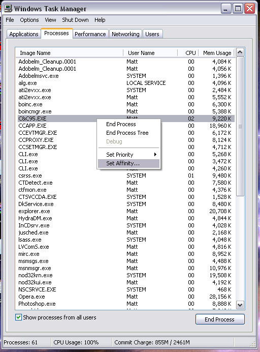 First, you'll want to start up C&C95. It doesn't matter if you have one of the disks in or not. Press the Windows key + M to minimize C&C95. Now, you'll want to open up the Windows Task Manager by pressing Ctrl + Alt + Del ONCE. Find the process named "C&C95.EXE", right-click it, and click "Set Affinity".