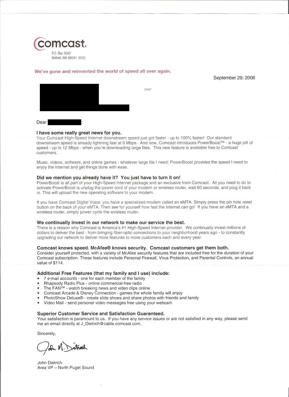 I believe I just received a scam that explains how Comcast upgraded to 12mbps. I was wondering if anyone here has also received this nonsense. Notice how it says that you have to restart your modem to get the new "operating software" (WHICH IS TOTALLY NONSENSE, being that modems don't use "operating software"). And there are a whole lot of other flaws in the letter, such as the email address being @cable.comcast.com instead of @comcast.com, and how there is no phone number provided. This is really confusing, because there isn't really any point in this letter except to make you restart your modem. Any ideas anyone?