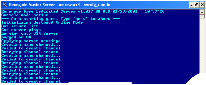 except, that when i start the Renegade Master Server, it fails to "Create Game Channel" ...and it keeps trying to create it again, again and again and it doesnt create it! it says "Failed to create game channel", and then it keeps trying.
