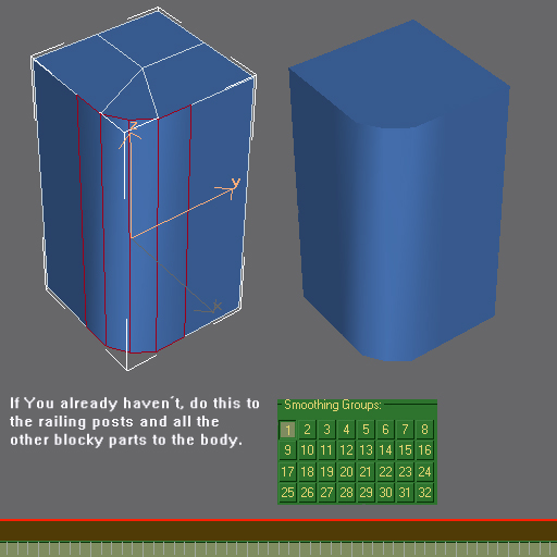 the railing posts need a few more polys with the smoothing, and the corners of the bocky base need another poly too.