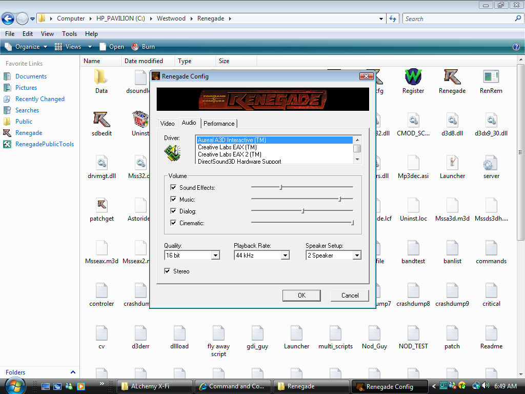 Oh ya, and if anyone else has any problems with this type of deal you will have to put dsound.dll and ALchemy.ini (two files shown below) into the renegade directory.