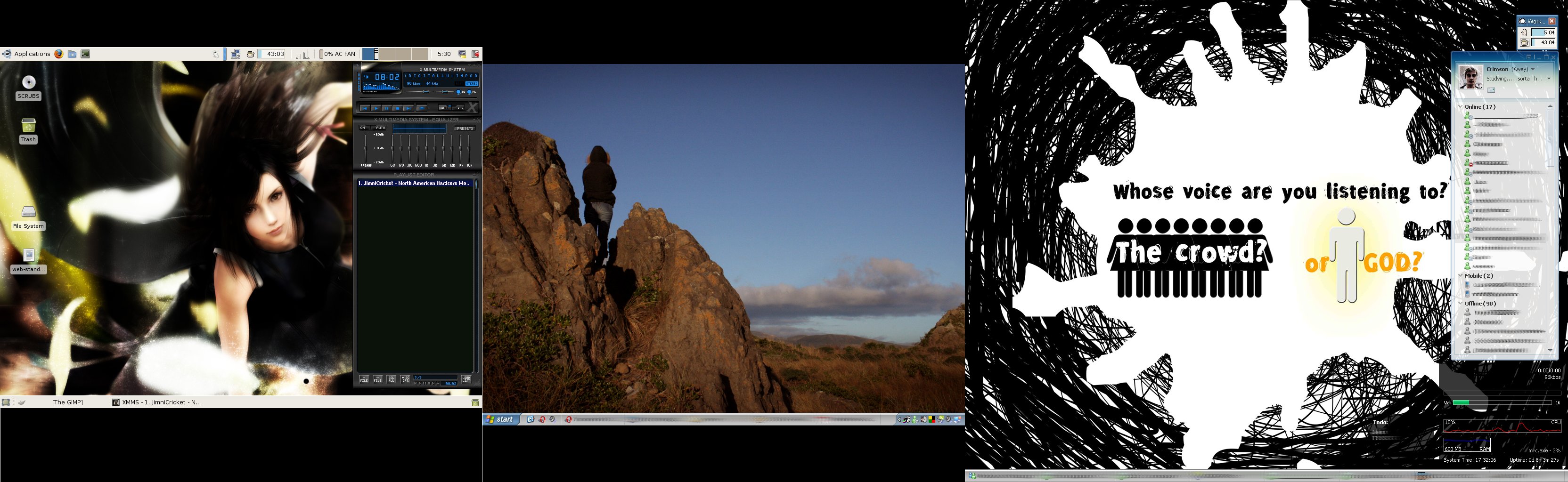 Wallpapers left->right: Found on deviantart, photo by a friend of mine, graphics art work by another friend.