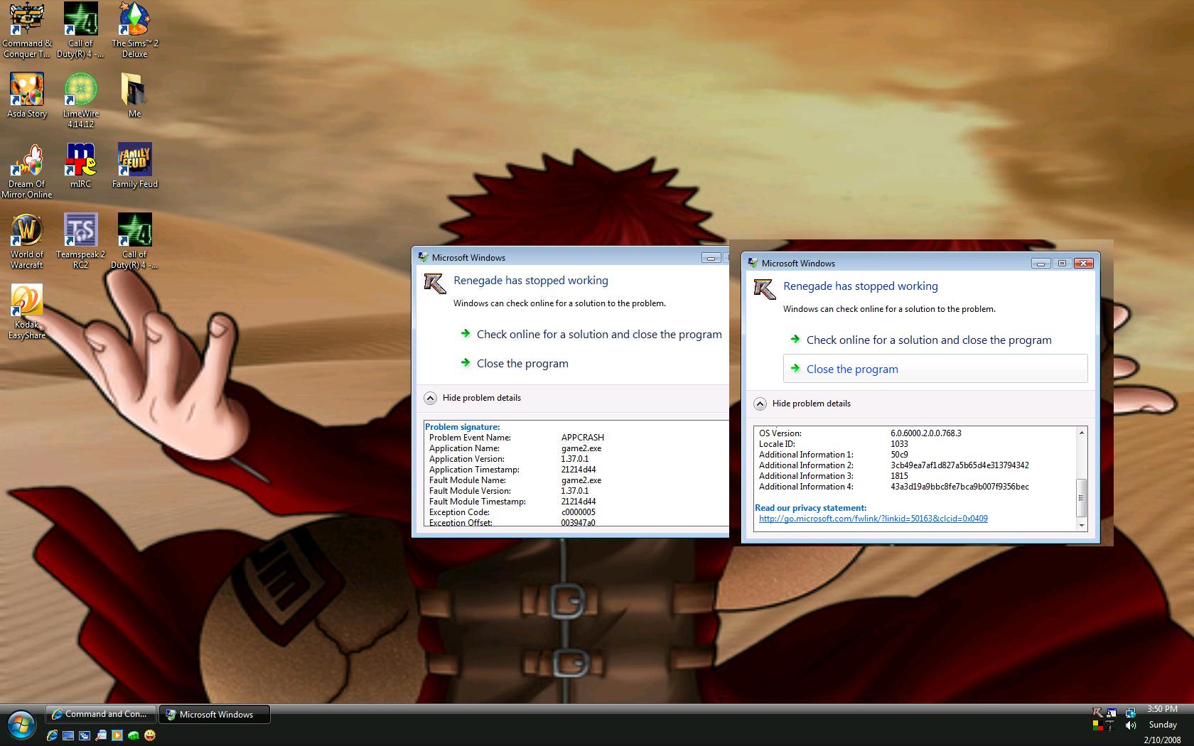 well i have been wanting 2 play renegade since ive gotten vista and i own the C&C first decade set so myrene is on there i cant get it 2 run cause just about everytime i try it i get an error which looks a little something like this errorcode #00000005 or sutmhign along the lines of that nature which is what ive been getting after i installed renguard I have the 1st Decades all the other C&C games work except Renegade And I tried everything so far I got the same results