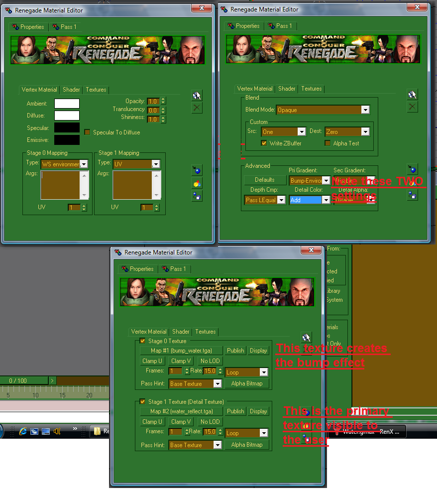 Also if you have level edit i highly suggest you go into C:Program files/ Renegade Public Tools/ How to/ W3d tutorials/Content/Vertex Material. That will explain all the types of settings allowed within renx and ren.