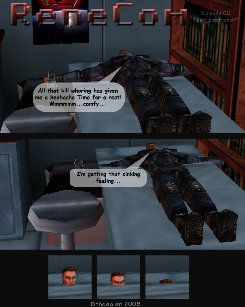 Havoc was posed in RenX for these shots (as describe in the previous post) In the third panel havoc was supposed to have a "bighead", but unfortunately resizing the bone didn't work.