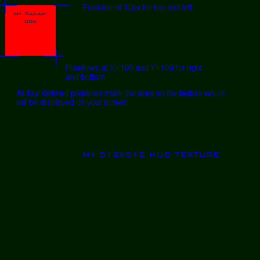 For example: You have a nice box for you radar in the left upper corner in your 512x512 texture but 10 pixel from the left and top border and this box is 100x100 pixel large you have to fill in: