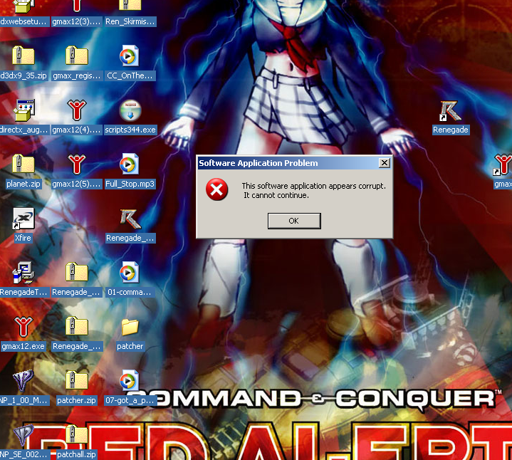 I am at my wit's end. I've been trying all day to get RenX to work. It keeps saying "Software Application Problem. This software application appears corrupt. It cannot continue." I have reinstalled it several times. I have Microsoft Windows XP Professional Service Pack 2.