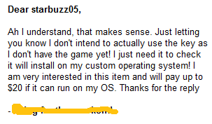 My question is what is he on? Install on custom OS WTF is he talking about? For all I know he already has "downloaded" the game files and needs a valid CD key to play online! I wonder how many unknowledgeable people that sell video games on eBay he has fooled with this lame tactic.