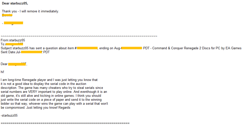 So just imagine if such a older-generation seller not familar with gaming gets a hurried message in the last moments of the auction from some cyberpuke casually asking "hey what's the serial?!!"