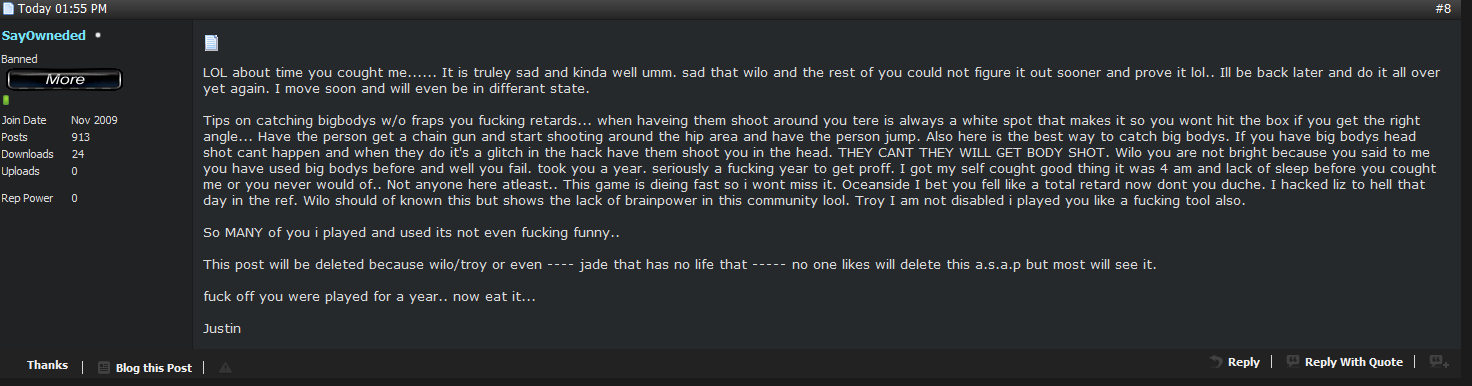 That means you too then. You went around like you were on some religious crusade against "cheaters", some of which were proven innocent. The irony is that you are the cheat. You constantly slagging Exodus off for banning you, and yet we were proven right all along.