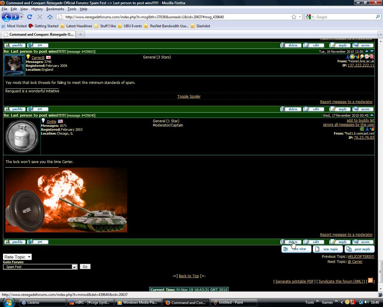 Re: Last person to post wins!!!!!! [message #439783 is a reply to message #439377] Fri, 19 November 2010 23:23 Go to previous messageGo to next message