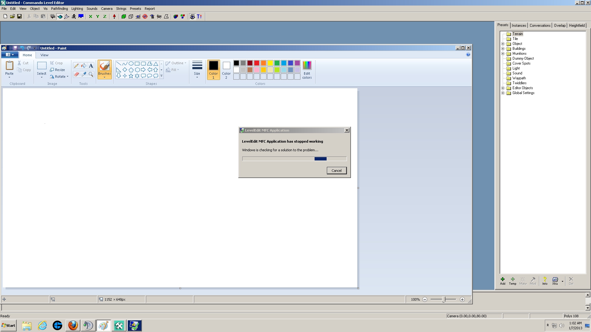 I've been having a problem with the Level Edit. I've been trying to edit a few mission maps for a server. I open up the program load a map, and it just stops responding out of the blue. I am running windows 7 and just be advised that I am running this as an administrator. Pic is below at the end. Any suggestions? THANKS!!