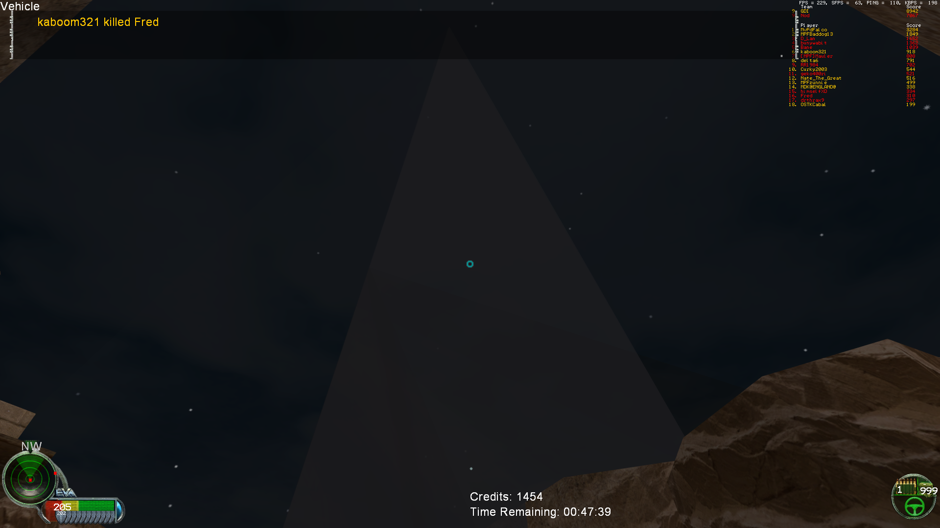 As I was saying before my computer decided to restart (it was like a blue screen but it decided not to display the blue screen...) That looks like what happens when there are too many polys on the screen (seen it on my laptop a few times and on my main computer once back when we were working on Rp2's power up system and it keep spawning power ups infinitely). The only thing that doesn't match that is that the issue appears to continue no matter where you look; normally it disappears for me when you look away from the point with too many polys.