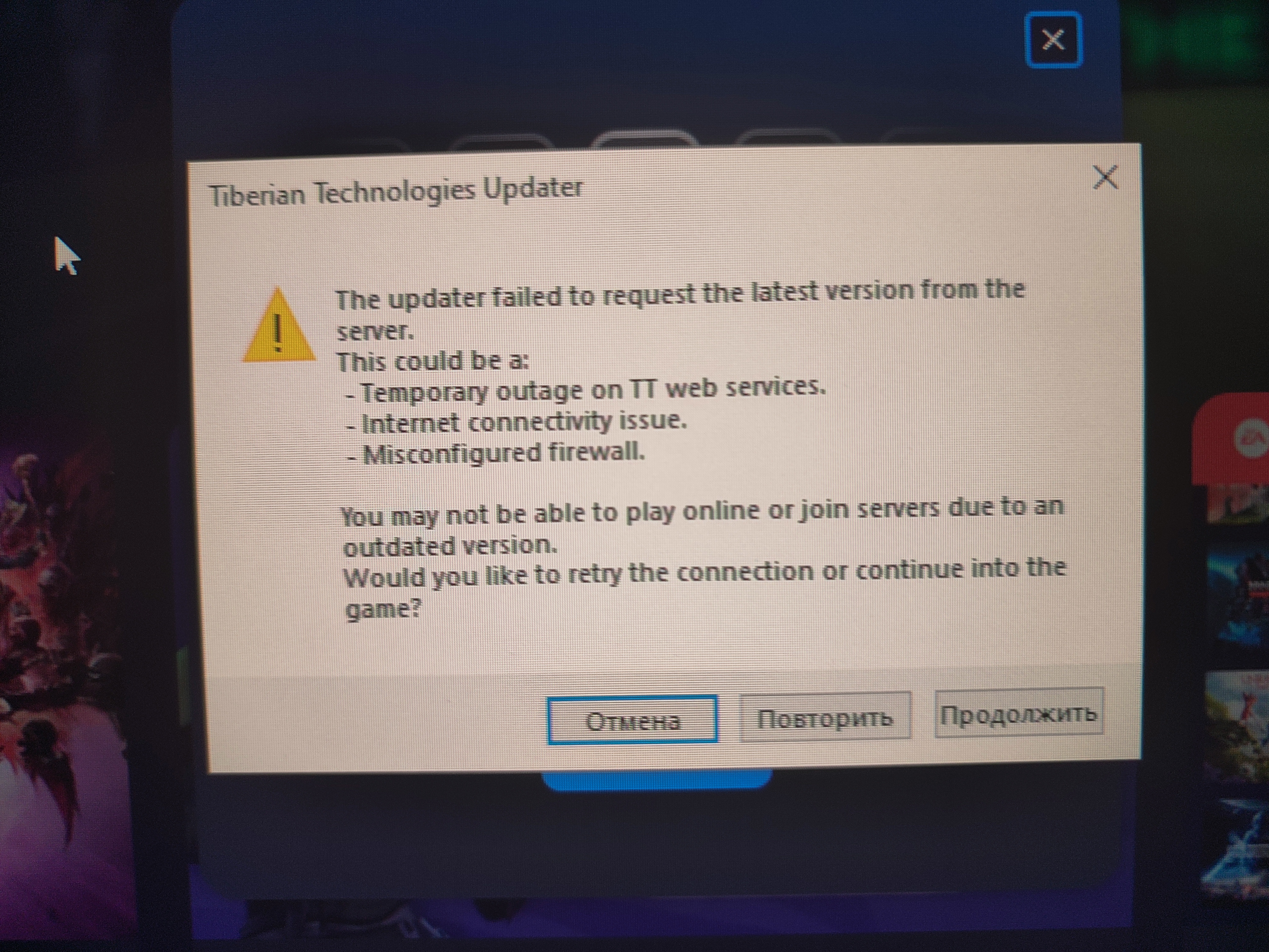 Today I bought a renegade in the Ea App. I downloaded Renegade, Installed the Tiberian Technologies patch version 4.8.3 and the W3d Hub launcher. The first time I managed to log into renegade, I played on the server, but when I tried to log into renegade the second time, this error appeared. What to do? Wi-Fi is fine. Maybe I need to set up a firewall somehow, but I do not know how to set it up or what to change there.