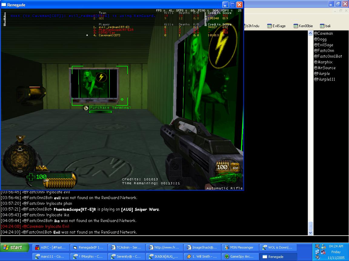 btw u are a lieing idiot. like i said no1 has access to my irc and for you to say u have seen some1 posting msgs ingame from irc other then me or my girlfriend you are absolutly lieng. also if you read the bot msg you will also see that it was another bot for my AOW server that was saying i was on the network, and i felt no reason to post the ss for the sniper bot becasue they were both saying the same thing. I have 2 bots 1 is for a sniper server and the other is for the AOW server. they both run properly and there is alot of ppl out there that will tell u that i dont cheat dont need to cheat. i will leave that up to ppl like u have have used them. and yes u have told me i used them for testing. LMAO like i really would beleave that. when i ran RTE and AUG and HFS and other clans no1 could even use them in anyway. so FUCK YOU and your dictored ss dont know how you didnt it but feel free to rg me anytime.