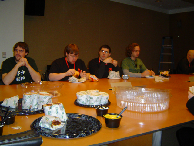 Here's a shot of us eating sandwiches for lunch. From left to right, there's a guy from purepwnage.com, a guy from StrategyInformer, Banshee from PPM, and a guy from ModToaster. The half-visible bald guy on the far right is a guy who goes by the moniker of "Skull". He's a friend of Dragon Dronet from Renegade Effects (not a reference to C&C Renegade) who made most of the costumes and props you'll see in the game. In the pre-order video, Dragon specifically mentions "Skull".