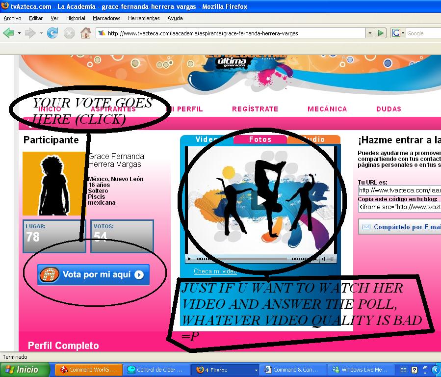 ok guys look, a friend of mine wants to join a contest that its sort kind of american idol (yes we even pirate that here in mexico. Surprised ) and in order to join she must have the most votes in a webpage, where there's a video of her singing and stuff... and yes I know she's not the beautiful type clearly (or at least at my perception, maybe for u, but who knows. :roll: ) I want her to join or at least to get as many votes as possible so she can be happy and do not feel like a failure, so please vote for her at this page: